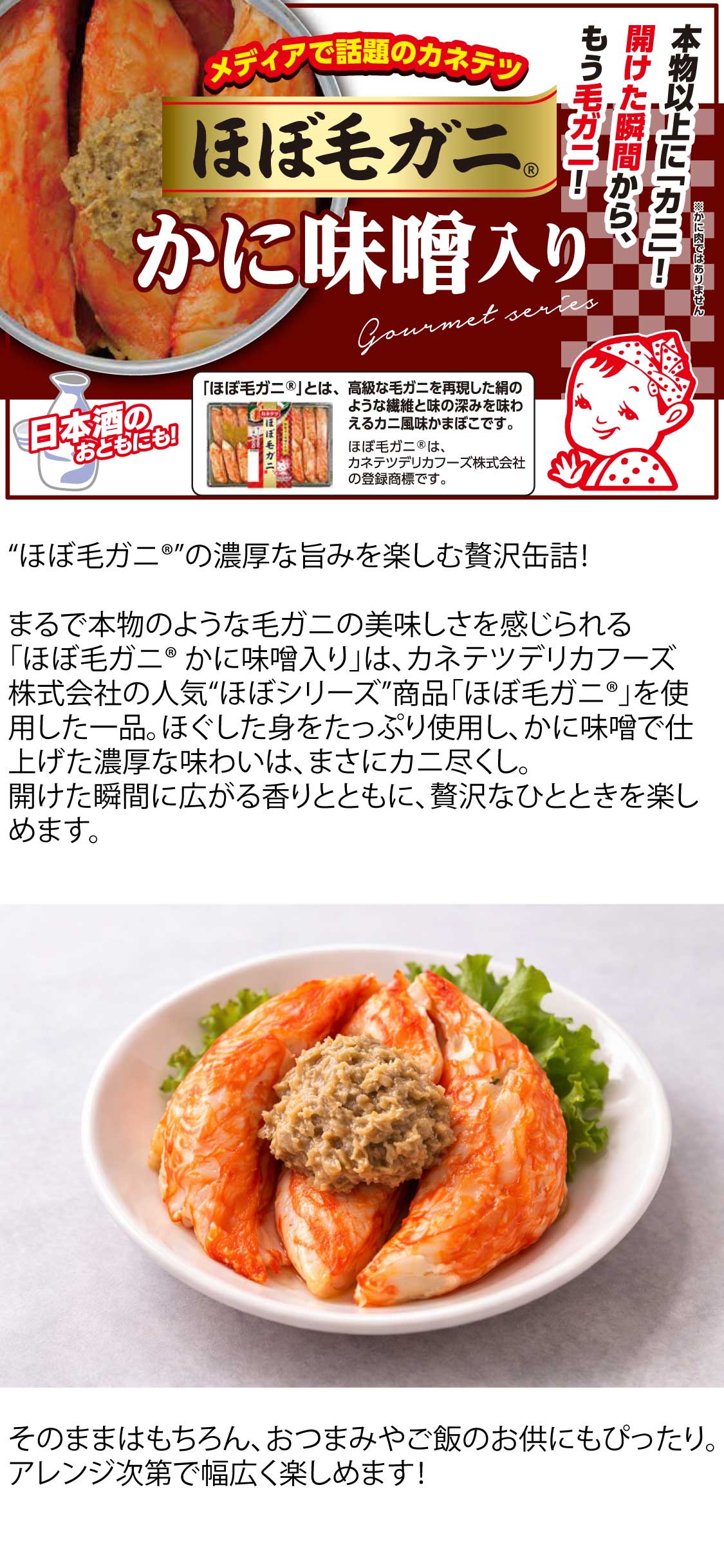 メディアで話題のカネテツ「ほぼ毛ガニ(カニ風味かまぼこ)」を使用した缶詰。ほぼ毛ガニをふんだんに入れ、カニ味噌で仕上げたカニ風味いっぱいの美味しさ。
